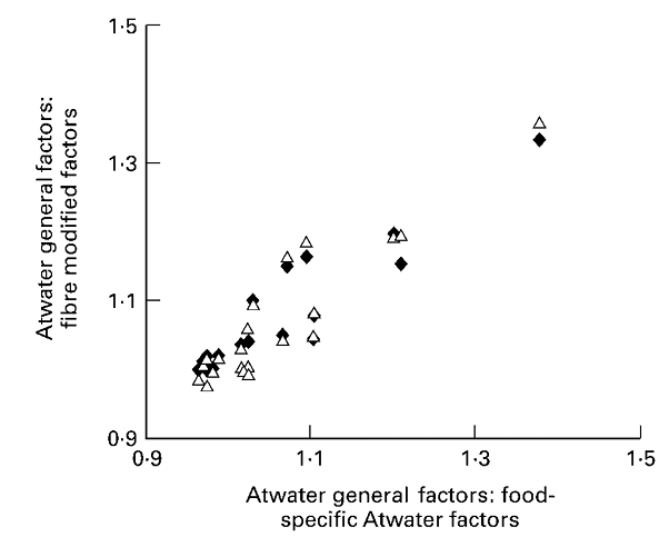 Los factores generales (Atwater) pueden dar lugar a errores de hasta el 38 % para alimentos individuales y estos se corrigen utilizando factores específicos de cada alimento.
