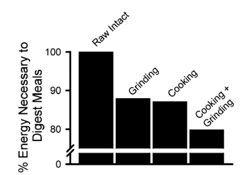 Este descubrió que el cocinar o moler la carne reducía el costo de la digestión en 12.7% por ciento y 12.4%, respectivamente y cuando el alimento se molía y se cocinaba, la combinación redujo la cantidad de energía necesaria para digerir la comida en un 23.4%.